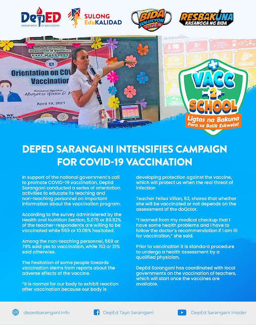 In support of the national government’s call to promote COVID-19 vaccination, DepEd Sarangani conducted a series of orientation activities to educate its teaching and non-teaching personnel on important information about the vaccination program.