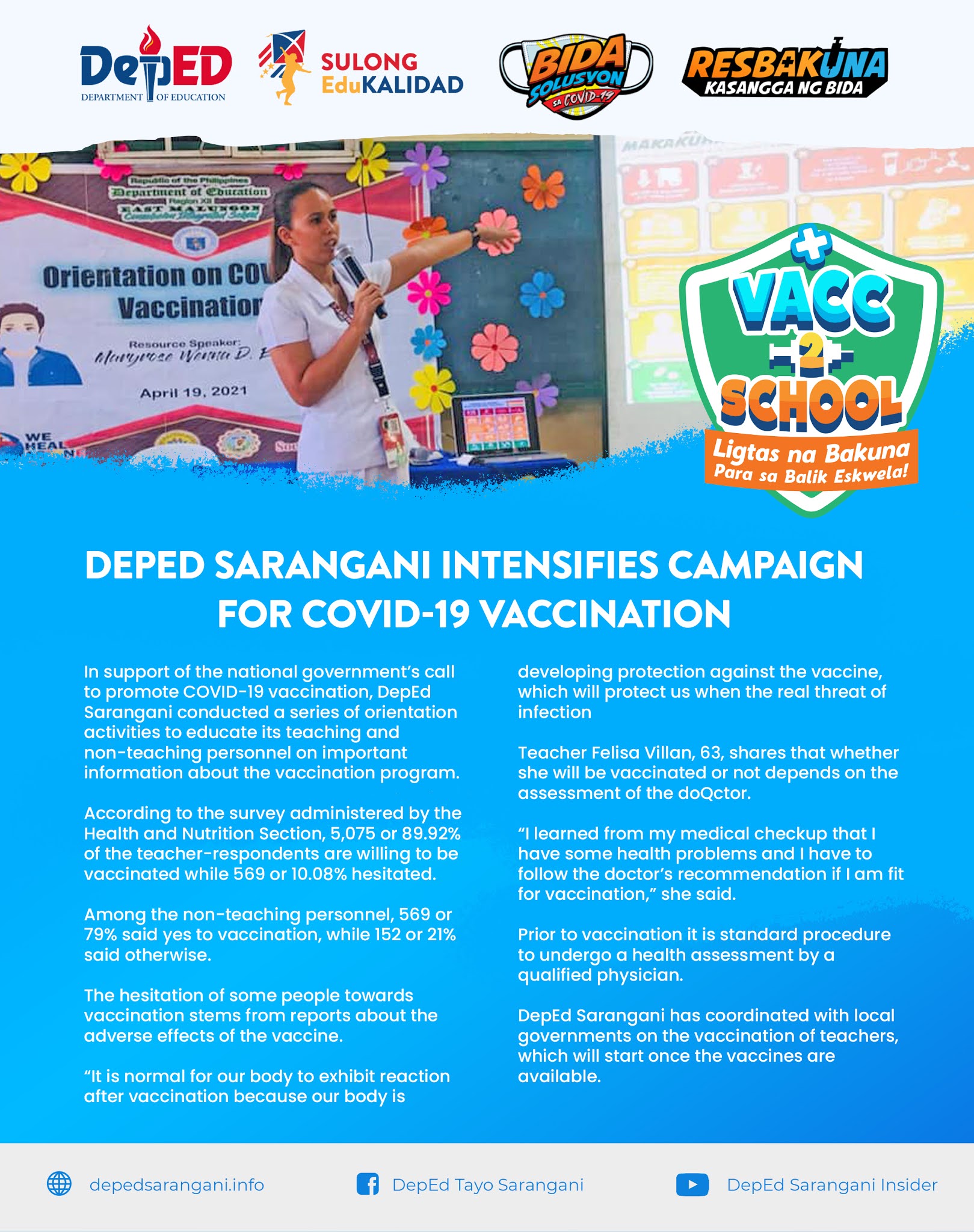 In support of the national government’s call to promote COVID-19 vaccination, DepEd Sarangani conducted a series of orientation activities to educate its teaching and non-teaching personnel on important information about the vaccination program.