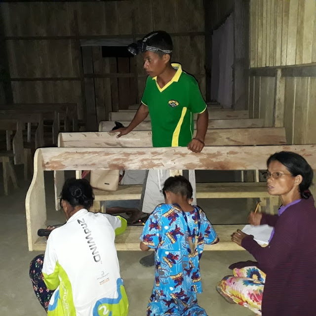 Sa gabi niya ginagawa ang pagtuturo sa mga magulang doon sa liwanag ng solar lamps at flashlight sa loob ng simbahan.