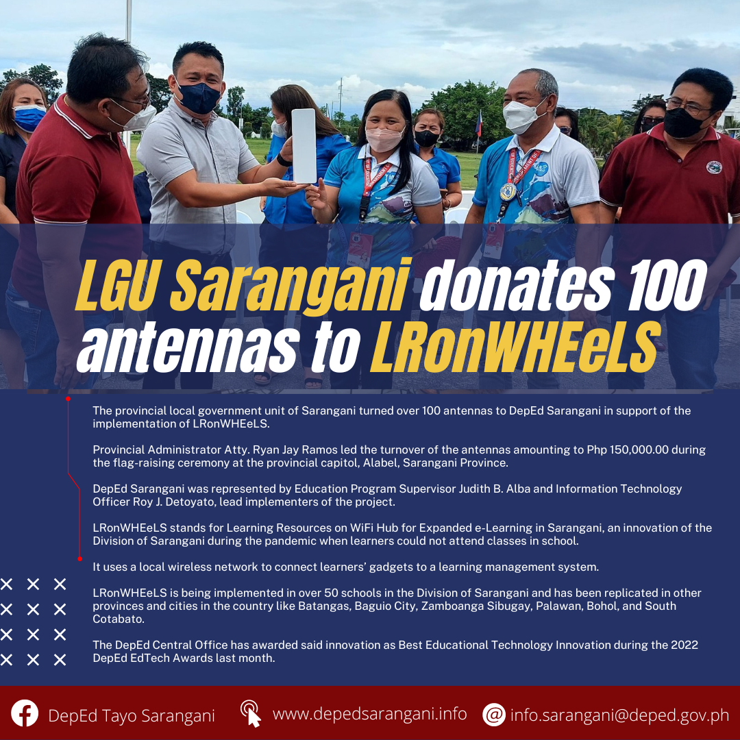 The provincial local government unit of Sarangani turned over 100 antennas to DepEd Sarangani in support of the implementation of LRonWHEeLS.