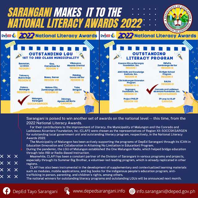 For their contributions to the improvement of literacy, the Municipality of Malungon and the Conrado and Ladislawa Alcantara Foundation, Inc. (CLAFI) were chosen as the representatives of Region XII-SOCCSKSARGEN for outstanding local government unit and outstanding literacy program, respectively, in the National Literacy Awards 2022.