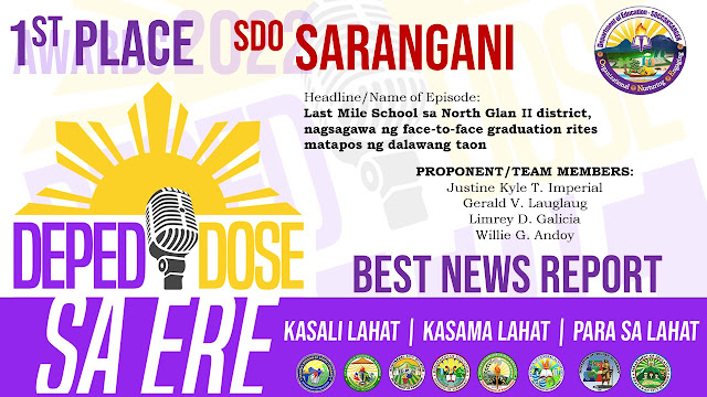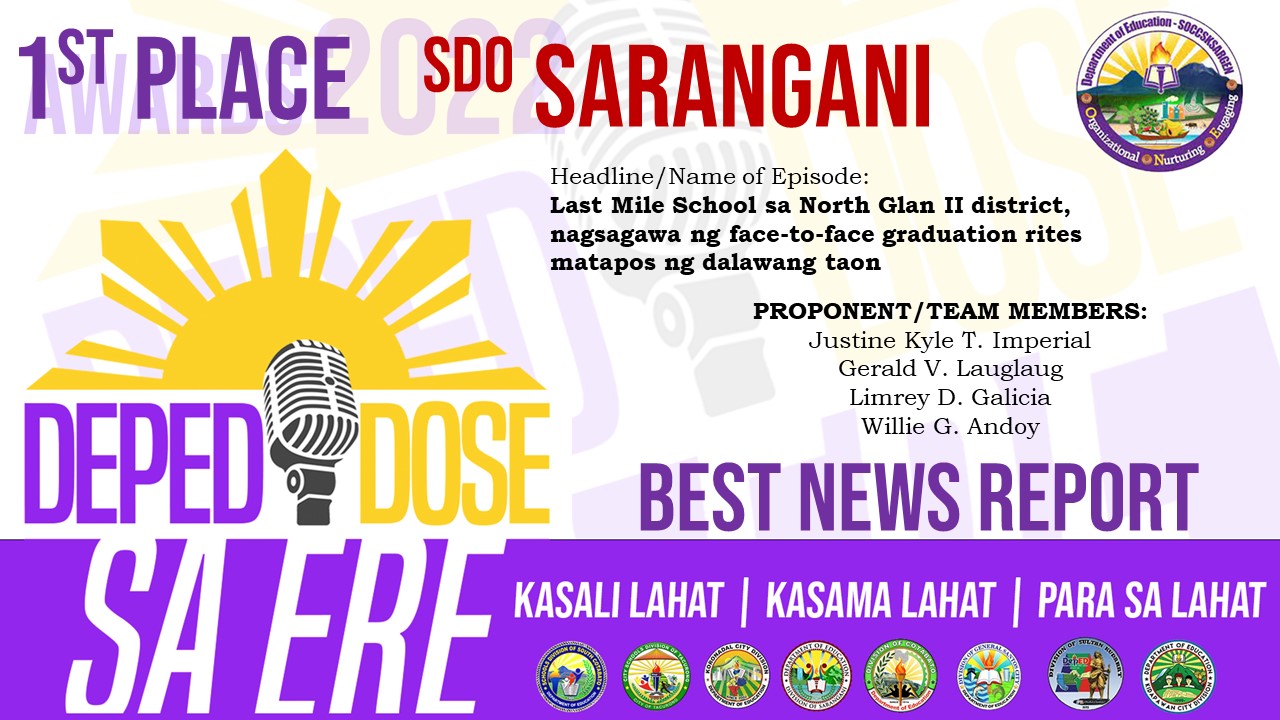 The news on the conduct of face-to-face graduation exercises in last mile schools in North Glan II district produced by the team of Justine Kyle Imperial, Gerald V. Lauglaug, Limrey Galicia, and Willie G. Andoy won as Best News Story in the DepEd Dose sa Ere Midyear Awards held virtually today, August 11 via DepEd Tayo Facebook pages in SOCCSKSARGEN.
