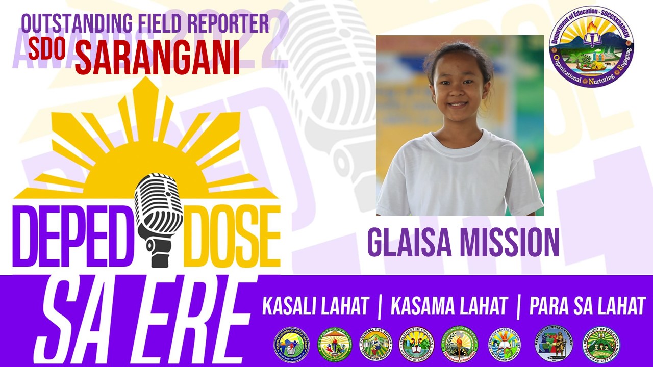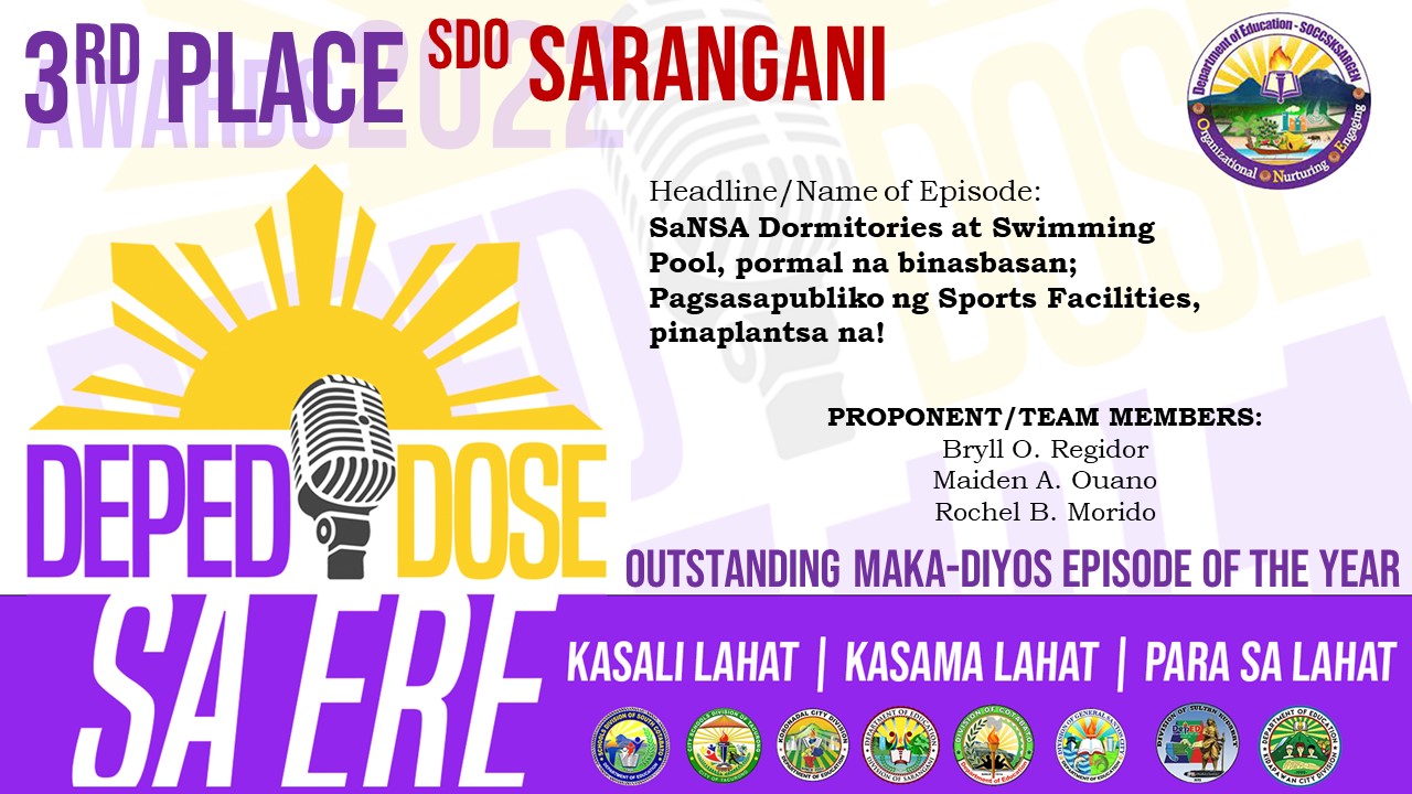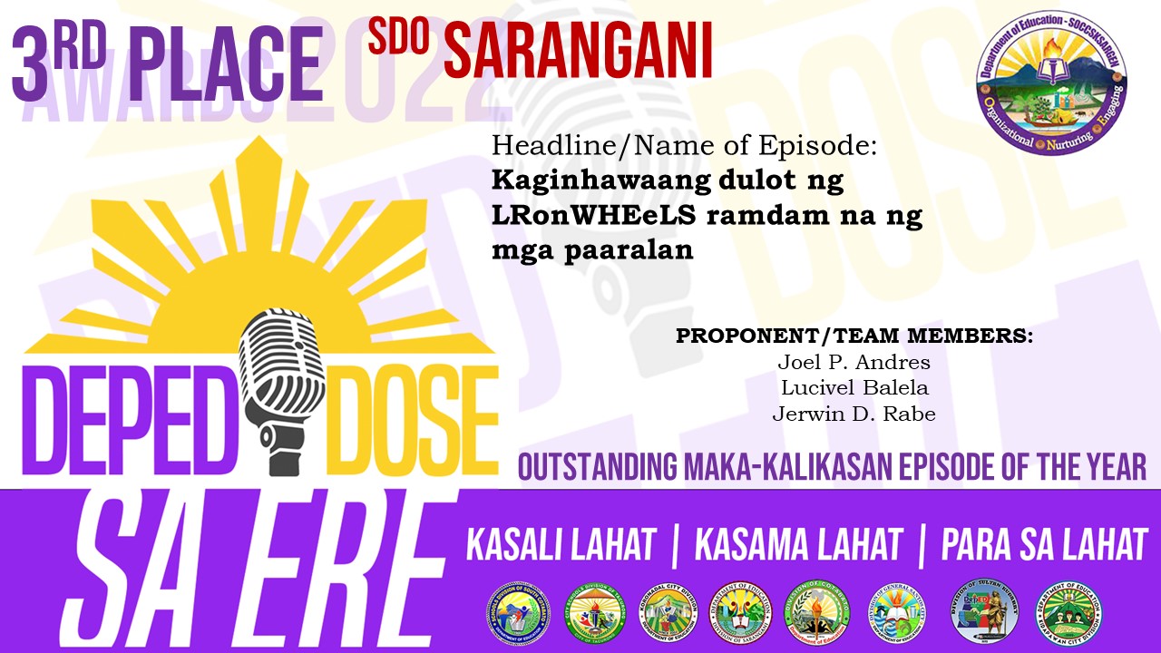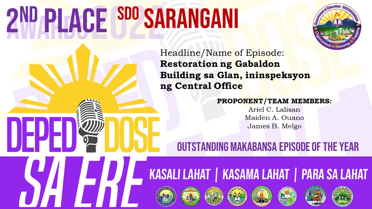 The news story produced by Ariel C. Lalisan, Maiden A. Ouano, and James B. Melgo on the restoration of the Gabaldon building at Glan Central Integrated SPED Center won 2nd place as Outstanding Makabayan Episode, while the story on the blessing of the facilities at the Sarangani National Sports Academy produced by Bryll O. Regidor, Maiden A, Ouano, and Rochell B. Morido and the story on the gains of the implementation of LR on WHEeLS in Tokawal National High School produced by Joel P. Andres, Lucivel Balela, and Jerwin D. Rabe both won 3rd Place in Outstanding Maka-Diyos and Outstanding Makakalikasan Episodes, respectively.