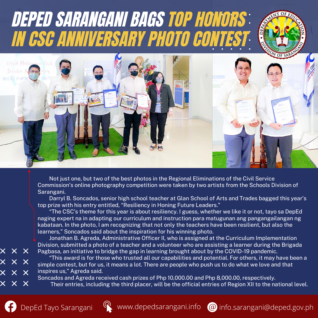 Not just one, but two of the best photos in the Regional Eliminations of the Civil Service Commission’s online photography competition were taken by two artists from the Schools Division of Sarangani.